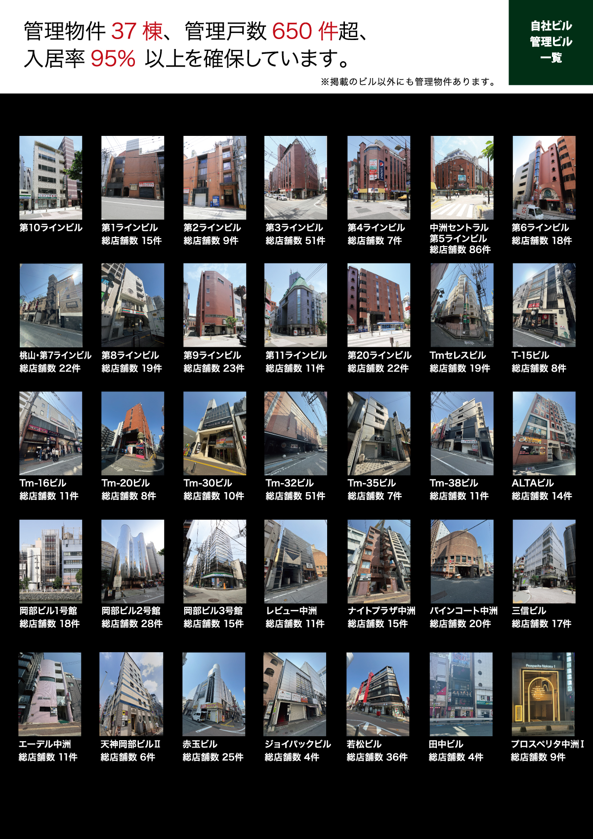 特に中洲地区においては30棟を超えるビルの管理、600件を超えるテナントの管理を行っております。
